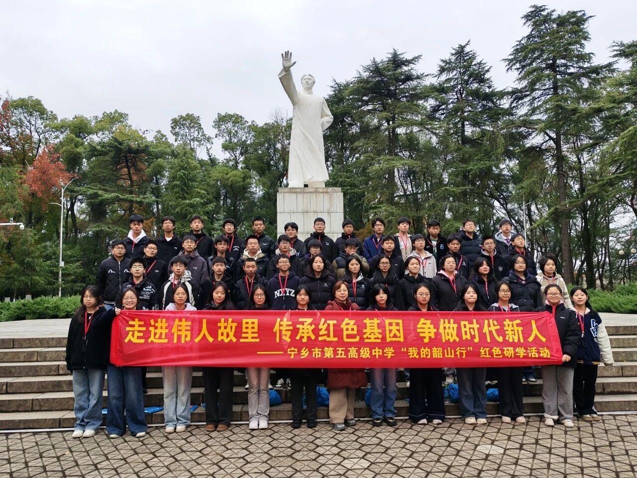 在实现中华民族伟大复兴的新征程上,追寻先辈足迹,赓续红色血脉,是新时代青年必修的“大思政课”。12月12日,怀着对历史的敬畏与对精神的求索,宁乡五中的学子们开启了一场超越时空的对话——前往韶山,这片中国革命的红色热土,进行一场深刻的思想淬炼与灵魂洗礼。这不仅是一次地理上的抵达,更是一次精神的溯源、信仰的重温与使命的唤醒。当研学之旅抵达终点,真正的抵达才刚刚开始。那些曾在课本上读过的故事,如今成了血脉里奔流的热度;那些遥不可及的精神坐标,如今化作可以追随的脚步。两天韶山行,是一堂行走的思政课——它让“信仰”从抽象的概念变成可触摸的感动,让“担当”从响亮的口号化作肩头的重量。星火已入眼,炬火在心中。